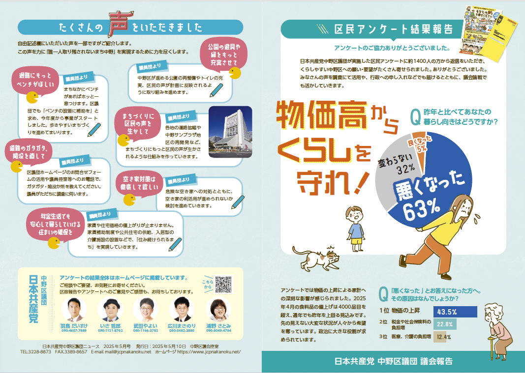 日本共産党中野区議団ニュース区民アンケート結果報告号を発行しました日本共産党中野区議団が実施した区民アンケートに約1400人の方から返信をいただき、くらしやすい中野区への願い・要望がたくさん寄せられました。ありがとうございました。みなさんの声を調査に手活用や、行政への申し入れなどでも届けるとともに、議会論戦でも活かしていきます。